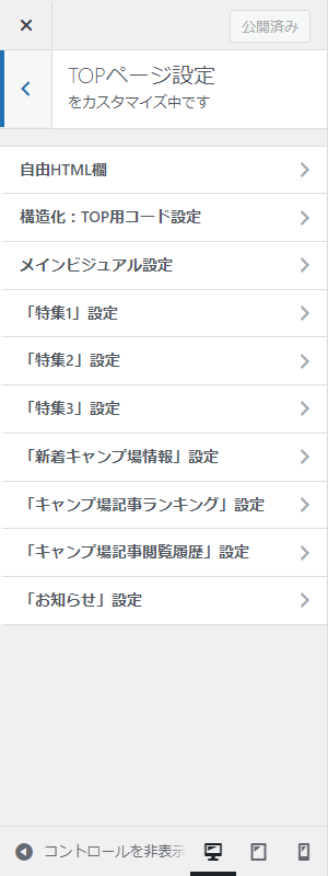 トップページ設定のメニュー内には下記の設定メニューがあります。